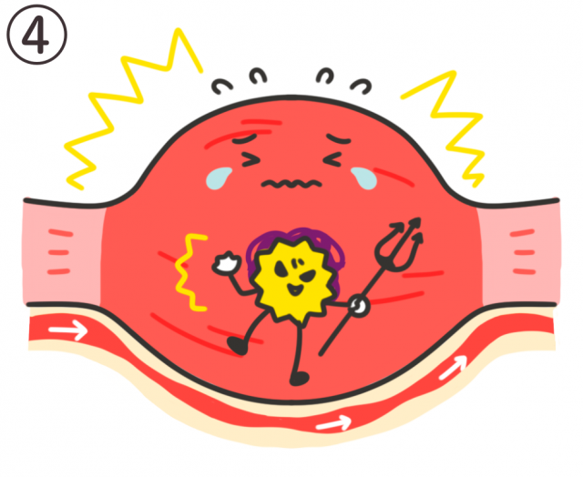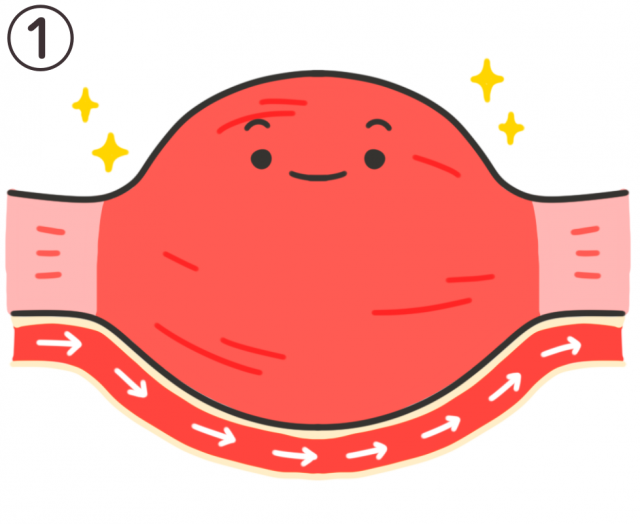 | ①正常な筋肉の状態 | ②血行不良により酸素や栄養素のエネルギーがもらえなくなる |