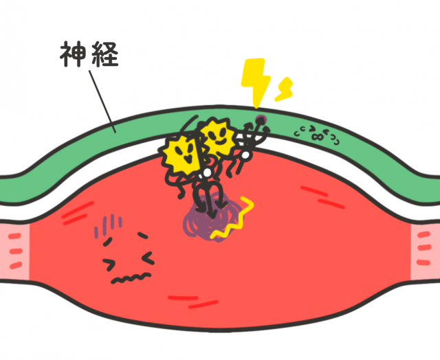 また、疲労物質も貯まり、そこから痛み・しびれが発生するという悪循環がまわります。